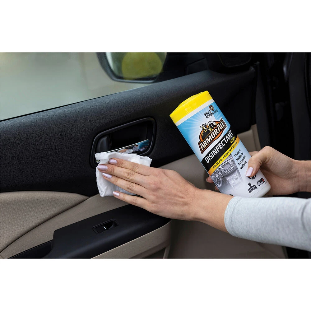 Armor All Disinfectant Wipes are made to provide quick cleaning, and disinfect frequently contacted surfaces in your vehicle. Dirt and germs can build up on frequently touched areas in the car such as the steering wheel, gear shift, entertainment console and door handles. Armor All Disinfectant Wipes kill Coronavirus* and other bacteria and viruses^ to keep your vehicle, boat, home, office or workshop clean and fresh.