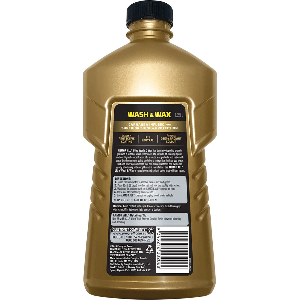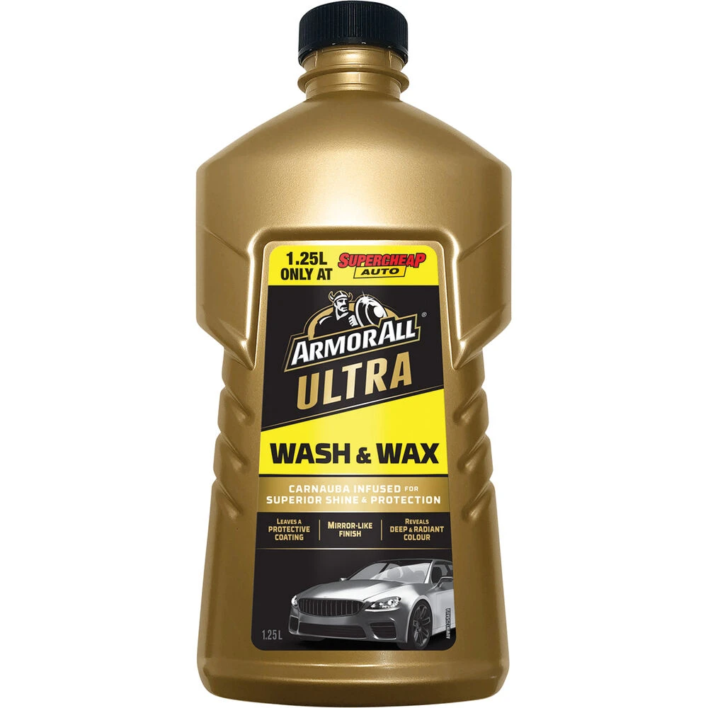ARMOR ALL® Ultra Wash & Wax 1.25L has been developed to provide you with a performance improvement over the traditional Armor All Wash & Wax you know and love. The infusion of strong yet gentle cleaning agents and our highest concentration of carnauba wax produces a glossy protective layer with a mirror-like shine. It also promotes hydrophobic properties, improving water beading and sheeting and minimizes contaminant adhesion to your vehicles paint.