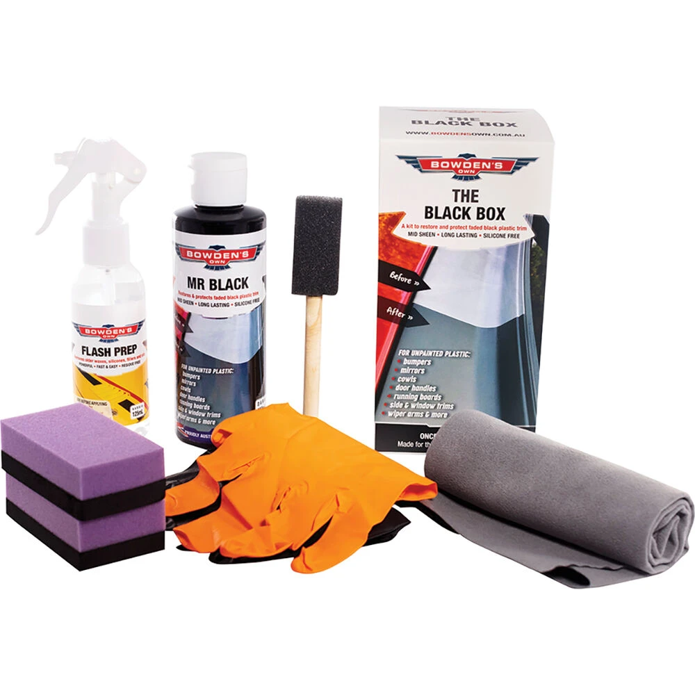 The Black Box is a complete kit for restoring and protecting faded unpainted black plastic trims all without nasty silicones. Included in the box is Bowden’s Own Flash Prep, a fantastic surface prep spray designed to elongate the application of many finishes including Mr Black. Mr Black is a non-silicone based color restorer and protectant for exterior unpainted trims, the result is a deep black, mid sheen finish that resembles that of a brand new OEM part.