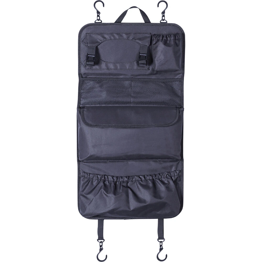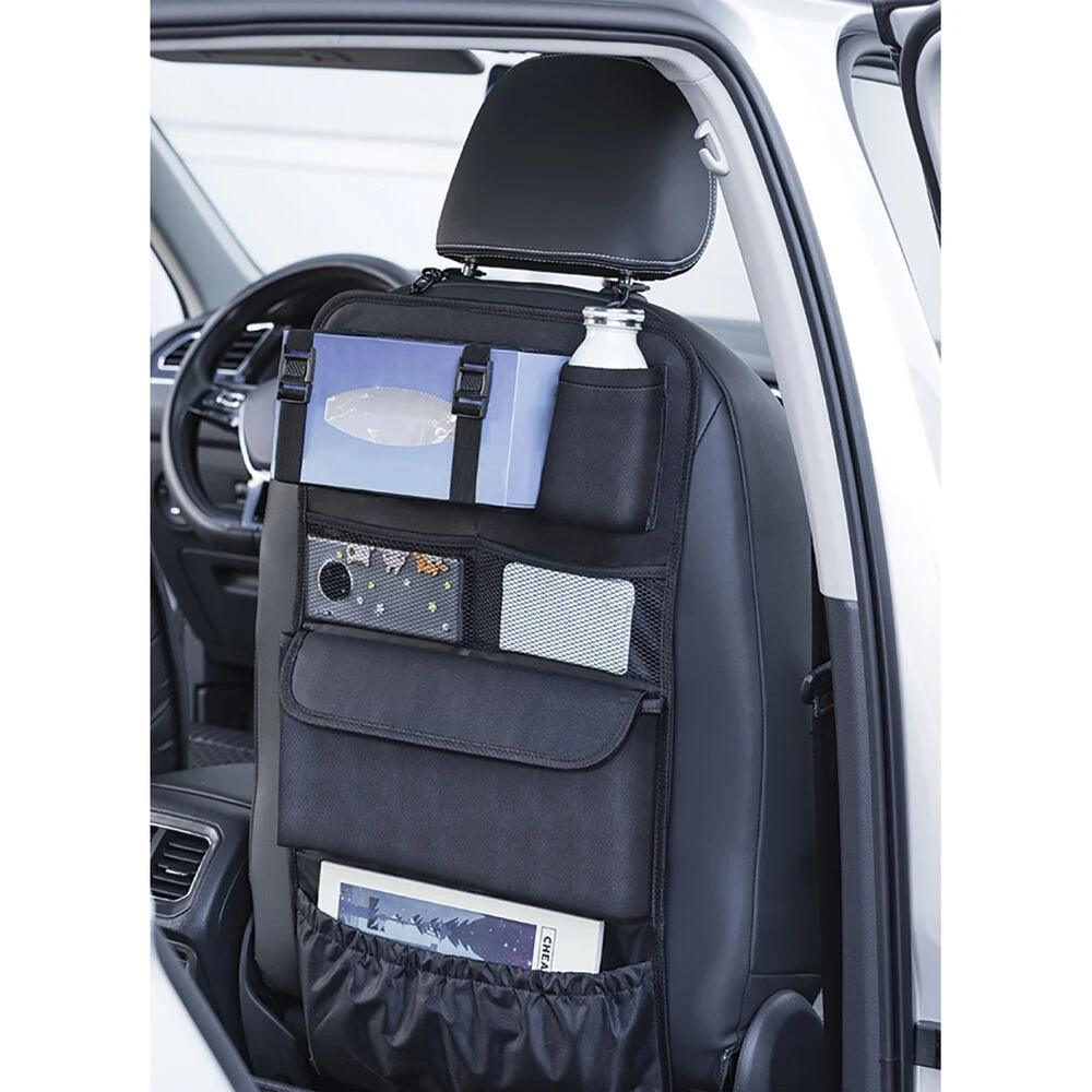- Handy backseat organiser with a variety of pockets and straps to help contain all your bits and pieces in the car
