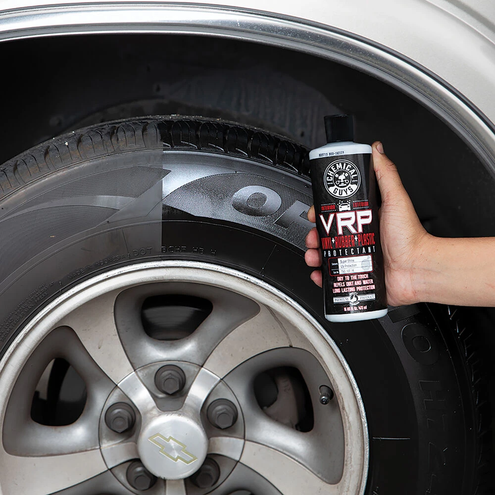 VRP is Vinyl, Rubber, Plastic – Chemical Guys shine and protectant for all of your vehicle vinyl, rubber and plastic surfaces. To restore that deep, black look to rubber and black plastics, and to protect all VRP surfaces, simply apply once clean with a microfibre or applicator pad, buff and within 10 minutes, VRP is hard at working protecting surfaces from harmful UV rays.