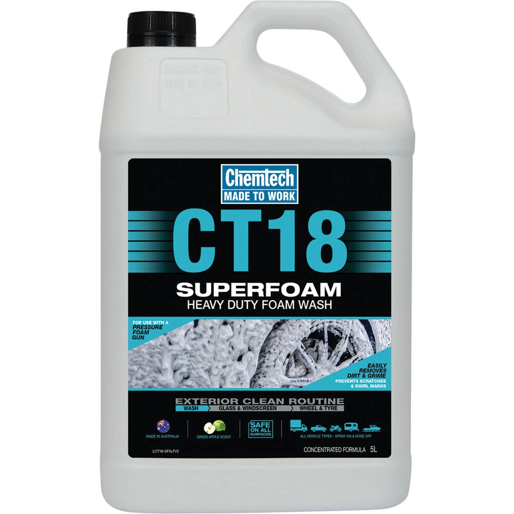 Chemtech® CT18 Super Foam is a pre-wash soak, or quick in-between clean, to remove grit and prevent scratching, swirls and excessive use of elbow grease. The long-lasting, high foam action, makes it tough on Aussie dirt, mud and grime, while still being gentle on your paint work and our planet, with its pH neutral and biodegradable formulation. Easy and fun to apply with a foam gun, the heavy-duty formulation, with rust inhibitors, lifts and loosens stubborn dirt and dried on mud from the biggest and most adventurous vehicles. From trucks and caravans to 4WD’s, boats and bikes, CT18® Super Foam™ is safe to use on any vehicle and almost any surface, including modern finishes, polished wheels, plastic trim, fibreglass, all metal types, rubber, vinyl and glass.