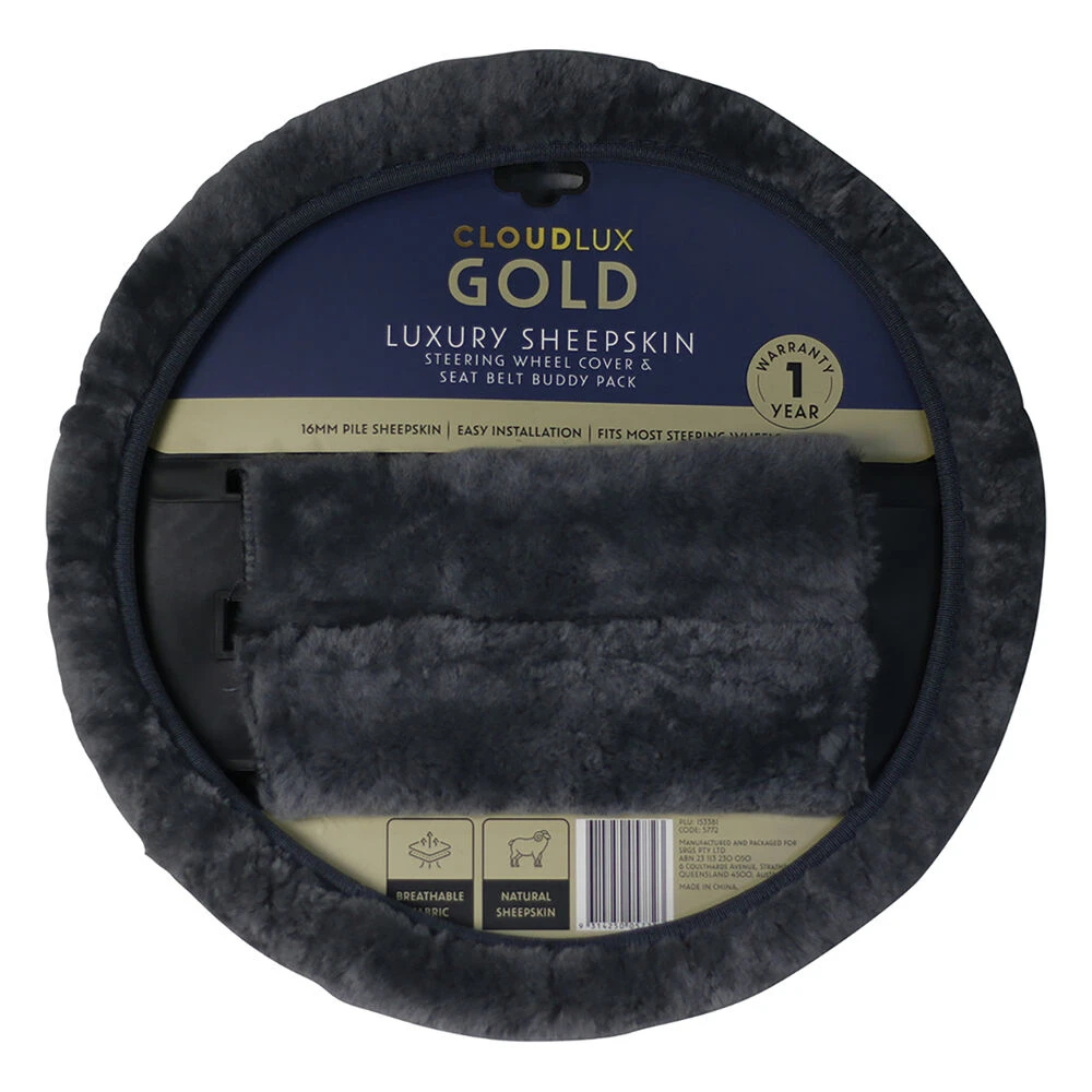 - Pack contains: sheepskin steering wheel cover & seat belt buddies