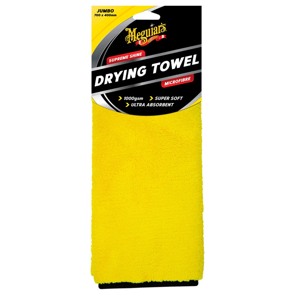 Meguiar’s Supreme Shine Drying Towel is super absorbent 1000gsm microfibre, specifically designed to safely and quickly dry your car. It’s thick, plush, premium-grade microfibre pile lifts and safely traps any residual grime within the fibres, rather than dragging it across your paint surface. This defends against the introduction of those annoying fine swirls and scratches that can occur when using an ordinary chamois or thin microfibre cloths. Measuring a jumbo 700mm x 400mm, it’s also super absorbent, rapidly soaking up water for faster, more efficient drying.