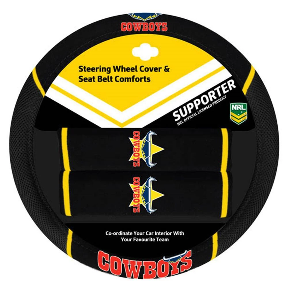 NRL Steering Wheel Cover And Seat Belt Buddies – Cowboys, 380mm Diameter