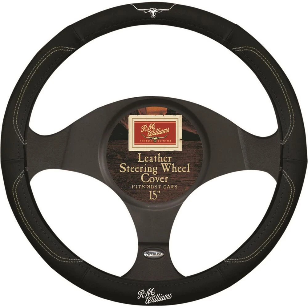 R.M Williams is well known for their quality leather boots, but that’s not the only popular product they manufacture. This R.M Williams steering wheel cover is made from the same high quality leather providing improved grip and feels great in hand. This cover is designed to suit most vehicles with 15″ steering wheels and offers protection from the Australian sun and UV and abrasion damage. The iconic R.M Williams bullhorns and signature are located at the top and bottom of the cover respectively as well as stylish white stitching around the hand grips. Spruce up your interior with one of R.M Williams leather steering wheel covers today.