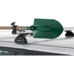 Are you looking for a more convenient method of storing your camping shovel when not in use? Rather than playing tetris with an awkwardly long shovel, grab the Rola Shovel Holder. Manufactured from black powder coated steel you can be sure these brackets will stay protected from corrosion and abrasion damage and they’re really easy to mount. Compatible with any roof racks equipped with global T-channels this system simply slots in from the end of the racks and the offset design means they’re perfect for use alongside baskets and trays. Once installed, slide your shovel in from the front of the vehicle and tighten the comfortable plastic hand wheels to secure. Not only do you now have immediate access to your shovel when you need it, but you have more cargo space and less grass and dirt in your vehicle.