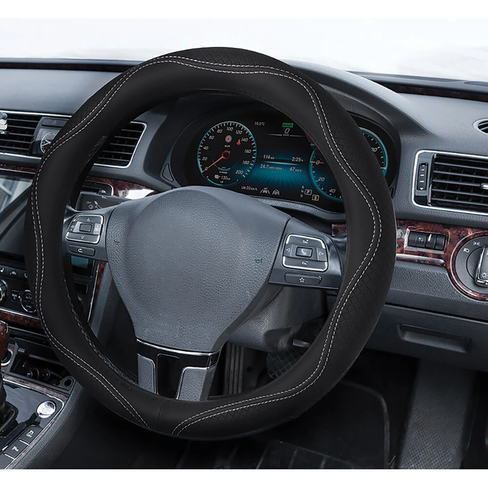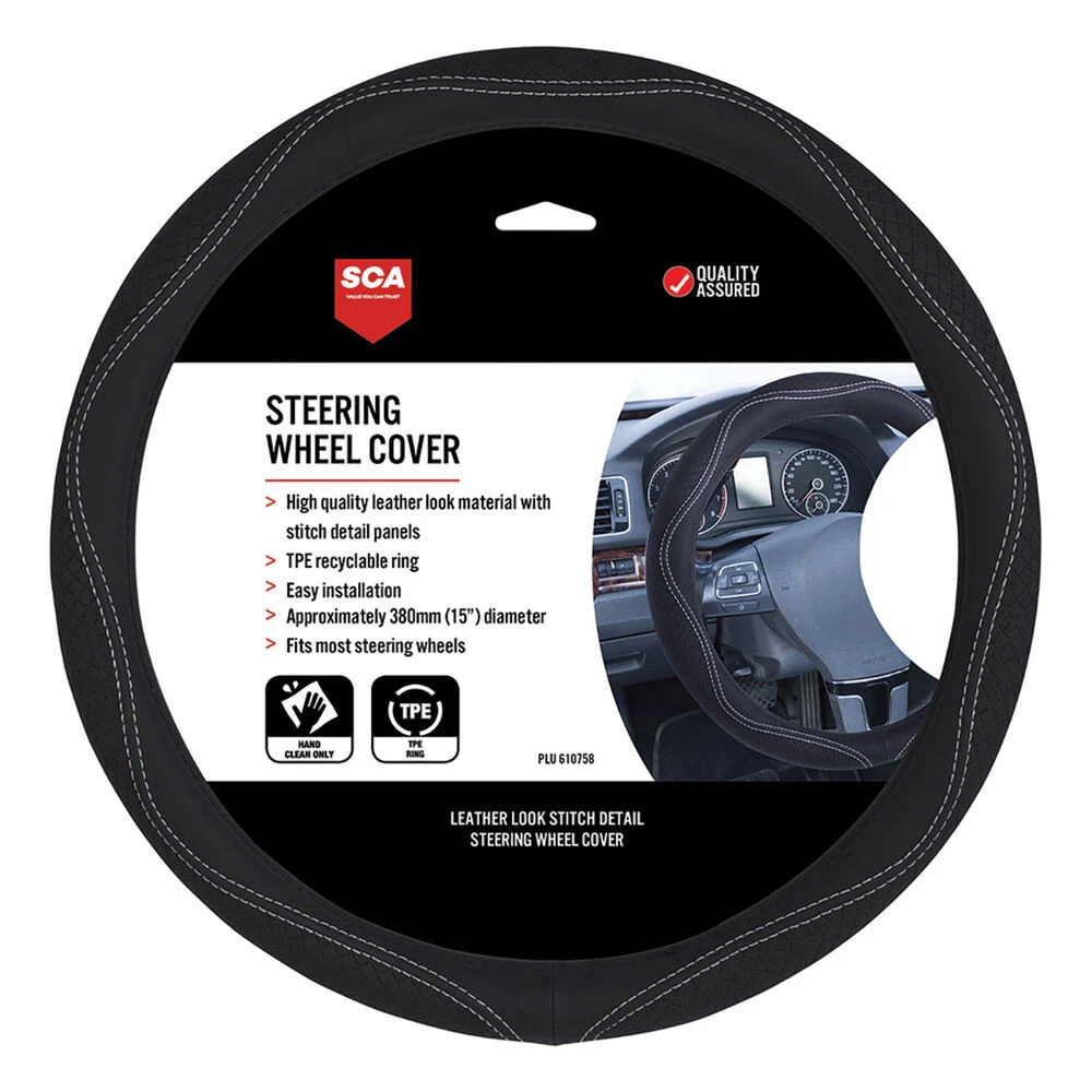 SCA Leather Look Patterned White Stitch Steering Wheel Cover – Black, 380mm Diameter