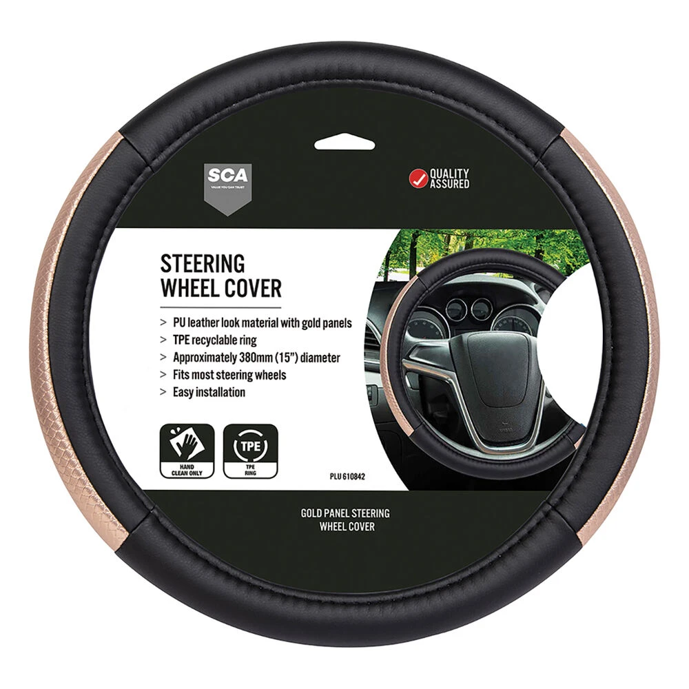 SCA Leather Look Steering Wheel Cover – Black/Gold, 380mm Diameter