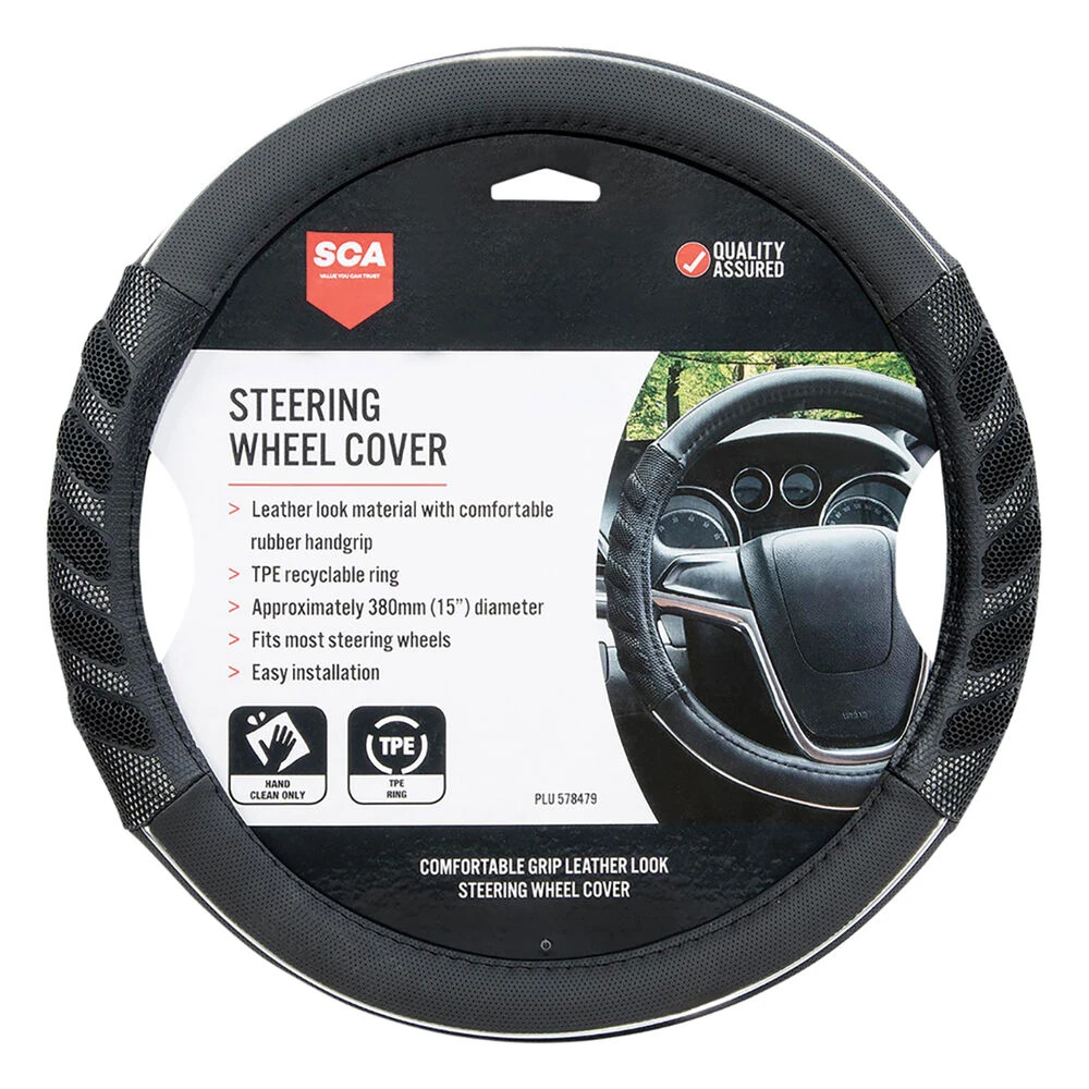 Protect your steering wheel from sun damage, keep your steering wheel cool and add some style to your interior with the SCA range of steering wheel covers. Available in a variety of styles, colours, fabrics and designs to suit everyone’s taste, SCA Steering Wheel covers are easy to fit and are designed to suit most standard vehicles with a 380mm diameter steering wheel.