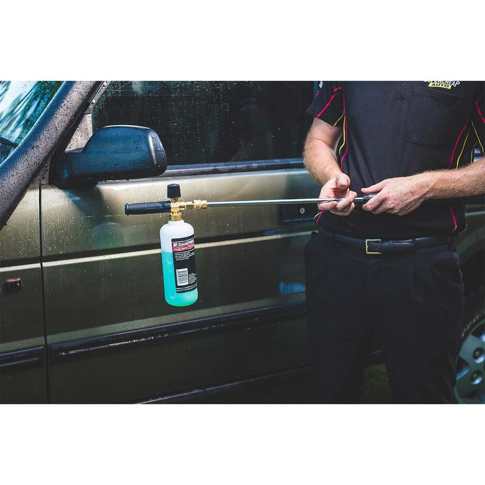 Cleaning is made easier with the ToolPRO foam sprayer attachment for the ToolPRO Petrol Pressure washer range! This foam sprayer is perfect for applying car wash or other cleaning substances to your car exterior, engine bay, wheels, under body or anywhere else on your vehicle. The foam sprayer simply connects to the end of a ToolPRO petrol pressure washer gun or any other petrol pressure washer that features the quick connect system. Then, all you have to do is fill it with your desired cleaning substance and away you go. The spray pattern is adjustable via the knob on the top to enable large area coverage with fewer passes or a direct jet for reaching difficult areas.